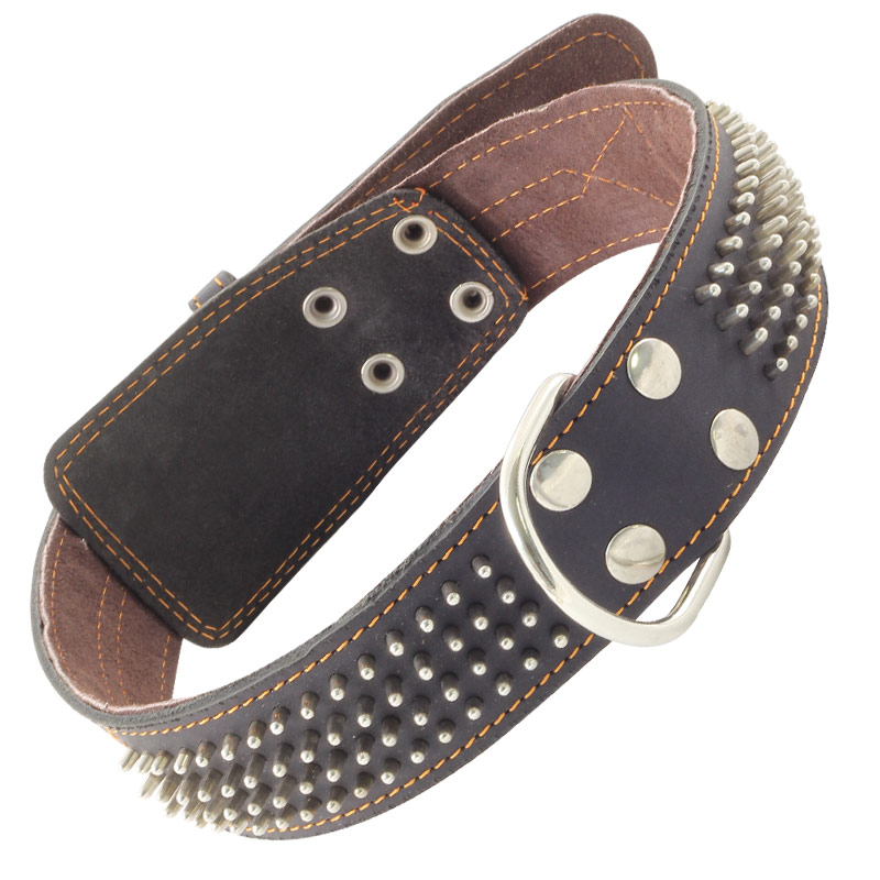 Толстый кожаный ошейник - незаменимый аксессуар для владельцев собак крупных пород. Изделие выполнено из мягкой, но прочной кожи высокого качества с использованием крепкой металлической фурнитуры в виде брутального декора. Предусмотренные отверстия позволяют удобно подгонять длину под индивидуальные параметры животного, а выносное металлическое кольцо отлично подойдет для надежного крепления карабина поводка, адресника или других аксессуаров. Размеры изделия: 810х45х5мм. Варианты расцветок: бежевый, коньяк, коричневый, черный.