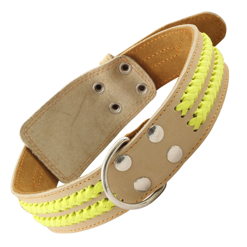 Толстый кожаный ошейник со светоотражателями - универсальный аксессуар для владельцев собак крупных пород. Двойное изделие выполнено из мягкой, но прочной кожи высокого качества с использованием крепкой металлической фурнитуры. Функциональное металлическое кольцо отлично подойдет для крепления карабина поводка, адресника или других аксессуаров, а светоотражающие элементы сделают вашего любимца максимально заметным на дороге в свете фар автомобиля. Размеры изделия: 810х45х4мм. Варианты расцветок: бежевый, коньяк, коричневый, черный.