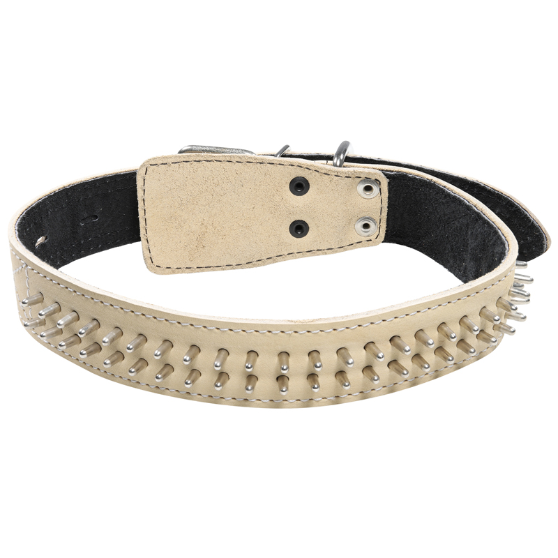 Этот ошейник - стильный кожаный аксессуар для крупных собак и незаменимый помощник для их владельцев. Двойное изделие выполнено из мягкой, но прочной кожи высокого качества с использованием оригинальной металлической фурнитуры в качестве брутального "колючего" декора. Предусмотренные отверстия позволяют удобно подгонять длину под индивидуальные параметры животного, а функциональное металлическое кольцо отлично подойдет для крепления карабина поводка, адресника или других аксессуаров. Размеры изделия: 720х36х3мм. Варианты расцветок: бежевый, коньяк, коричневый, черный.