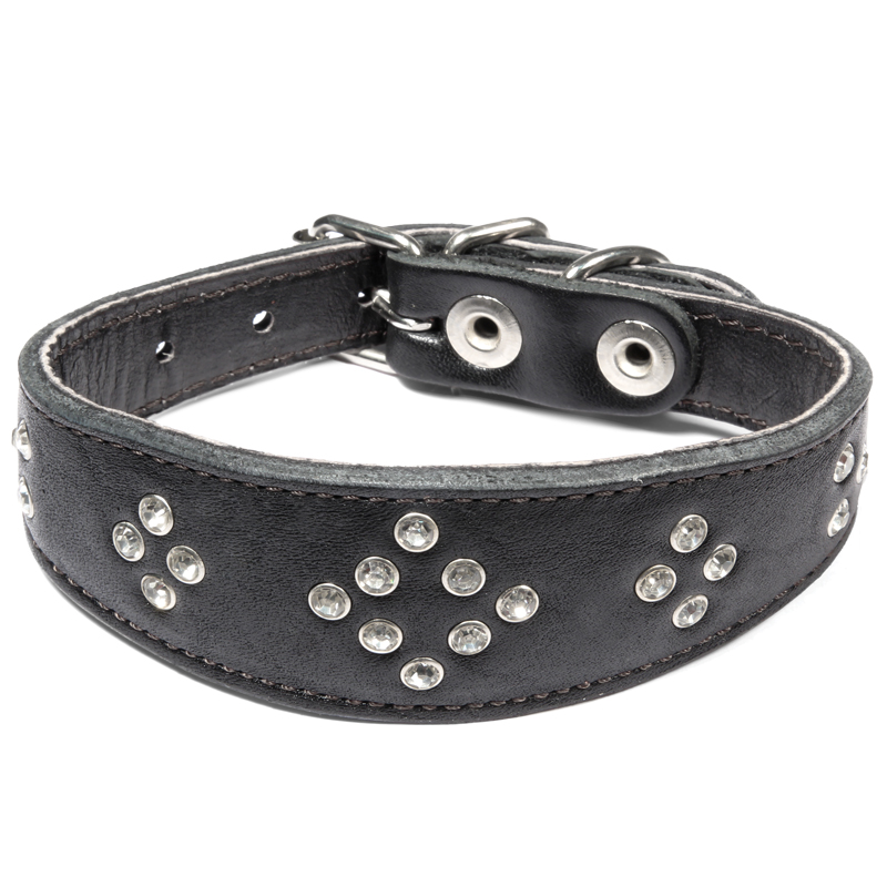 Кожаный ошейник с расширением и стразами - незаменимый аксессуар таких пород как такса, ливретка, уиппет и грейхаунд. Такой ошейник не вредит шейным позвонкам, позволяет правильно водить собаку и учит питомца правильно нести голову. Двухслойное изделие выполнено из мягкой, но прочной кожи высокого качества с использованием брутального декора из крепкой металлической фурнитуры. Предусмотренные отверстия позволяют удобно подгонять длину под индивидуальные параметры животного, а выносное металлическое кольцо отлично подойдет для надежного крепления карабина поводка, адресника или других аксессуаров. Размеры изделия: 300*15*3мм. Варианты расцветок: коньяк, коричневый, черный.