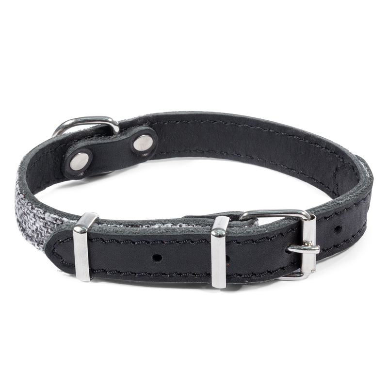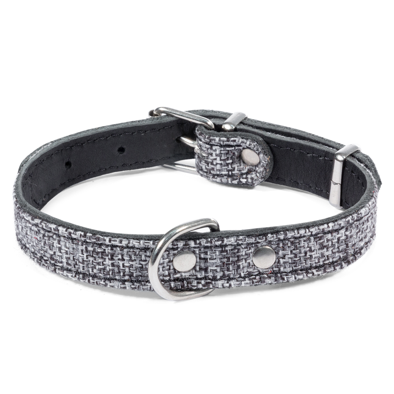 Кожаный ошейник "Твид" сделан в классическом сдержанном стиле. Нижний слой сделан из кожи, устойчивой к холодам и перепадам температур. Верхний слой декорирован фактурной твидовой тканью. Ошейник оснащен двумя петлями для регулирования поводка.