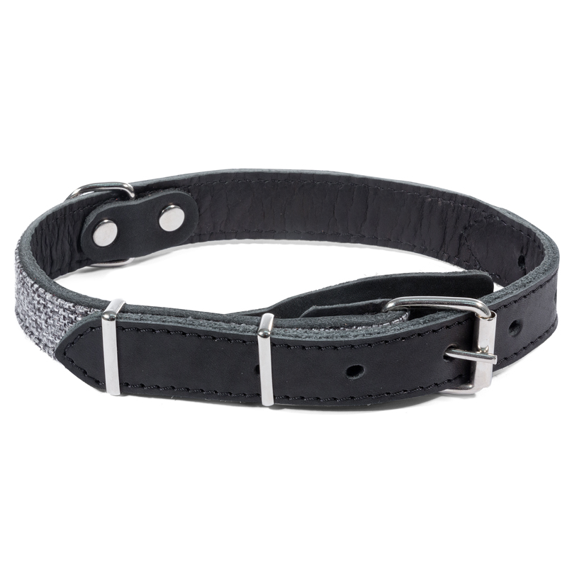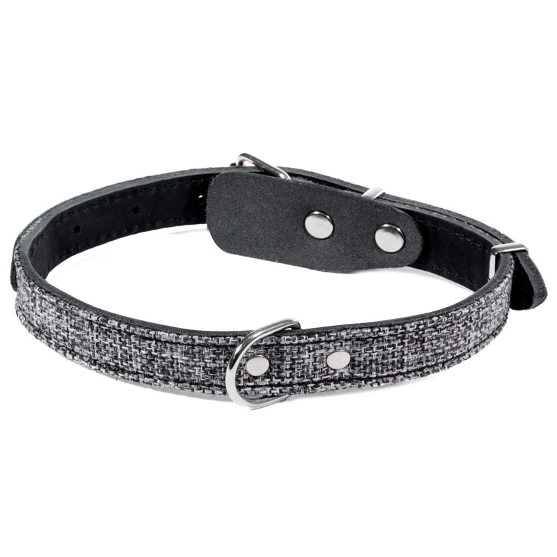 Кожаный ошейник "Твид" сделан в классическом сдержанном стиле. Нижний слой сделан из кожи, устойчивой к холодам и перепадам температур. Верхний слой декорирован фактурной твидовой тканью. Ошейник оснащен двумя петлями для регулирования поводка.