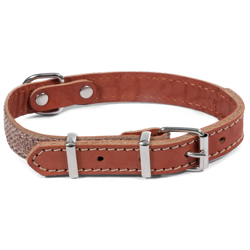Кожаный ошейник "Твид" сделан в классическом сдержанном стиле. Нижний слой сделан из кожи, устойчивой к холодам и перепадам температур. Верхний слой декорирован фактурной твидовой тканью. Ошейник оснащен двумя петлями для регулирования поводка.