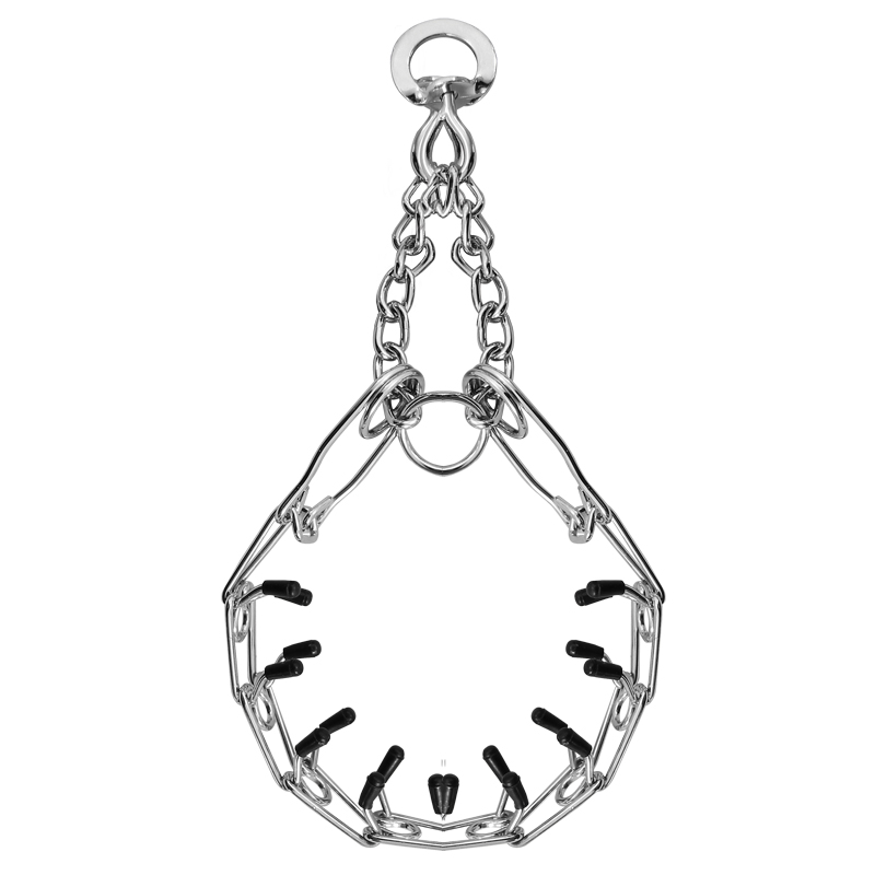 Строгий ошейник-удавка с защитными пластиковыми насадками на шипах - функциональный аксессуар для собак средних и крупных пород и эффективная мера воздействия при длительных прогулках и интенсивной дрессировке. Расположенные внутри ошейника шипы позволяют координировать все действия собаки и держать ее под строгим контролем. При этом пластиковые насадки на шипах защищают кожу питомца от царапин и повреждений. Диаметр проволоки - 3мм, длина ошейника - 500мм. Цвет: хром.