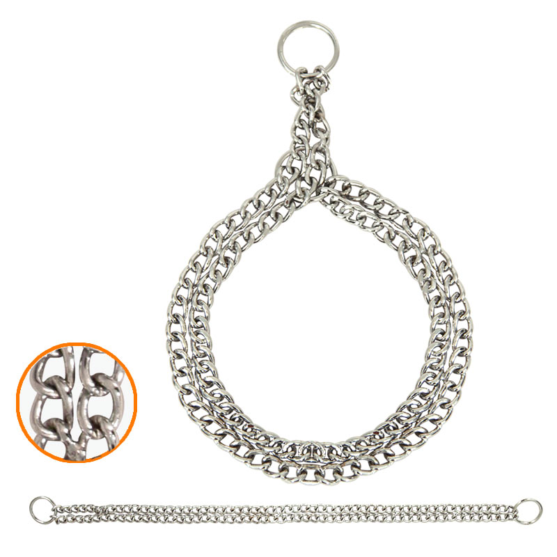 Двухрядный металлический ошейник-удавка, затягивающийся при натяжении поводка. Служит для дрессировки с целью усиления воздействия при рывках. Не перетирает шерсть. Выбирать длину цепочки нужно так, чтобы у собаки при надевании ошейника проходила голова, но не слишком свободно, чтобы он самопроизвольно не слетал и собака его не потеряла при наклоне головы или в прыжке. Диаметр проволоки - 3мм, длина - 700мм.