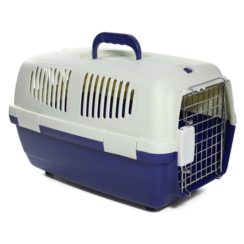 Переноска выполнена из прочного пластика. Оснащена вентиляционными окошками, металлической дверцей, надежным замком и удобной ручкой для транспортировки. Максимальная нагрузка: 3кг. Цвет: верх - молочный, низ - индиго. Размер: 480*290*280мм.