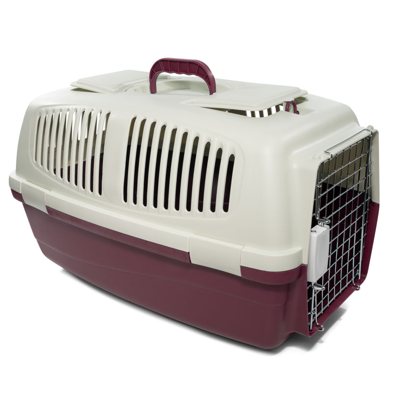 Переноска выполнена из прочного пластика. Оснащена вентиляционными окошками, металлической дверцей, надежным замком и удобной ручкой для транспортировки. На крышке расположены два люка, которые могут использоваться а качестве карманов для сопутствующих предметов или как дополнительная вентиляция. Максимальная нагрузка: 9кг. Цвет: верх - молочный, низ - бургунди. Размер: 620*390*380мм.