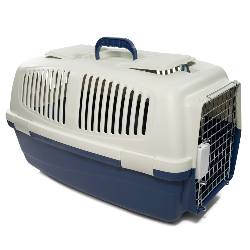 Переноска выполнена из прочного пластика. Оснащена вентиляционными окошками, металлической дверцей, надежным замком и удобной ручкой для транспортировки. На крышке расположены два люка, которые могут использоваться а качестве карманов для сопутствующих предметов или как дополнительная вентиляция. Максимальная нагрузка: 9кг. Цвет: верх - молочный, низ - индиго. Размер: 620*390*380мм.