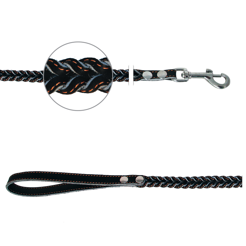 Прочный, долговечный и оригинальный кожаный поводок с плетением "косичкой". Поводок применяется для прогулок и дрессировки. Изделие снабжено надежным металлическим карабином, а специальный переходник позволяет карабину крутиться вокруг своей оси, предотвращая запутывание. На поводке имеется петля, которая одевается на руку для более удобного использования. Варианты расцветок: бежевый, коньяк, коричневый, черный. Размер изделия: 14х1100мм.
