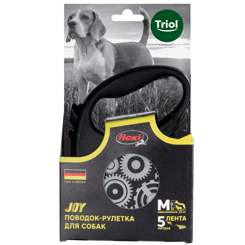 Рулетки для собак flexi – это безусловное качество, подкрепленное многолетним опытом, которое теперь доступно и поклонникам бренда TRIOL. Идеальное исполнение, прочный и, в то же время, приятный на ощупь пластик, запатентованный тормозной механизм и легендарная надежность стали более доступны благодаря сотрудничеству российской компании и немецкого производителя. Рулетки новой коллекции производятся в Германии, собираются вручную и проходят десятки проверок качества перед выпуском с завода. Гарантия производителя составляет два года и предоставляется только на функционирование механизма размотки и не распространяется на повреждения, возникшие в результате укусов собаки или прочего ненадлежащего использования рулетки. В рулетках серии Joy предусмотрена возможность крепления специального мультибокса - компактный контейнер для гигиенических пакетов удобно фиксируется прямо под ручкой! Мультибокс приобретается отдельно. Длина ленты: 5м. Максимальная нагрузка: 25кг. Цвет рулетки: черный, цвет рисунка: серый. Рулет