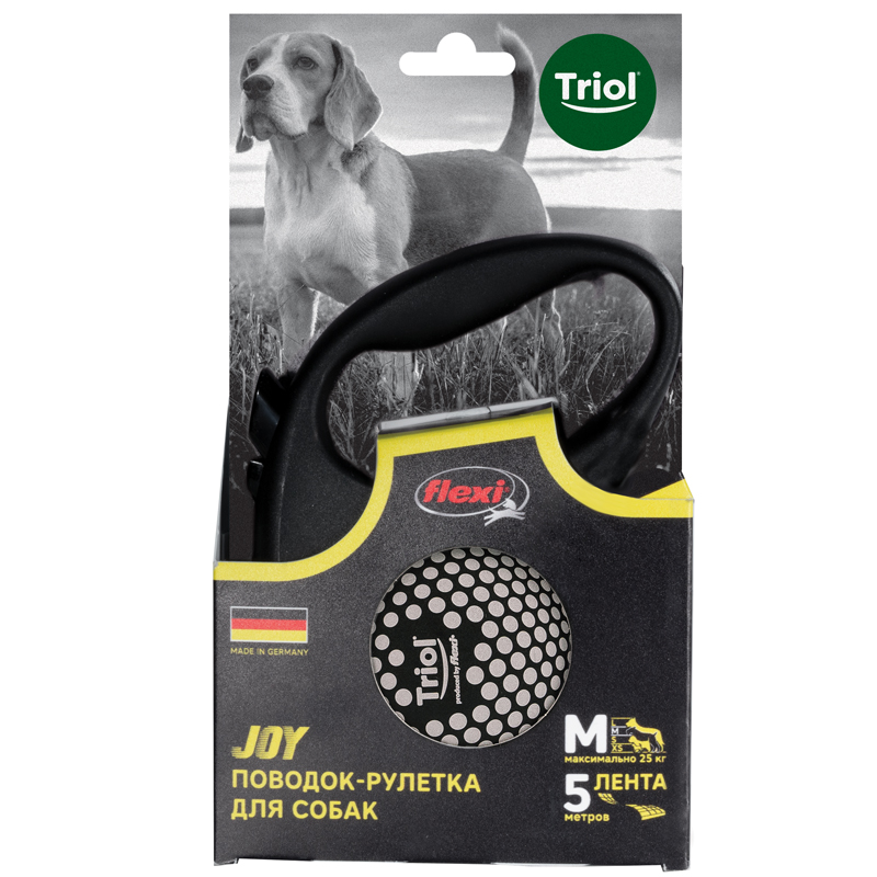 Рулетки для собак flexi – это безусловное качество, подкрепленное многолетним опытом, которое теперь доступно и поклонникам бренда TRIOL. Идеальное исполнение, прочный и, в то же время, приятный на ощупь пластик, запатентованный тормозной механизм и легендарная надежность стали более доступны благодаря сотрудничеству российской компании и немецкого производителя. Рулетки новой коллекции производятся в Германии, собираются вручную и проходят десятки проверок качества перед выпуском с завода. Гарантия производителя составляет два года и предоставляется только на функционирование механизма размотки и не распространяется на повреждения, возникшие в результате укусов собаки или прочего ненадлежащего использования рулетки. В рулетках серии Joy предусмотрена возможность крепления специального мультибокса - компактный контейнер для гигиенических пакетов удобно фиксируется прямо под ручкой! Мультибокс приобретается отдельно. Длина ленты: 5м Максимальная нагрузка: 25кг Цвет рулетки: черный, цвет рисунка: серый