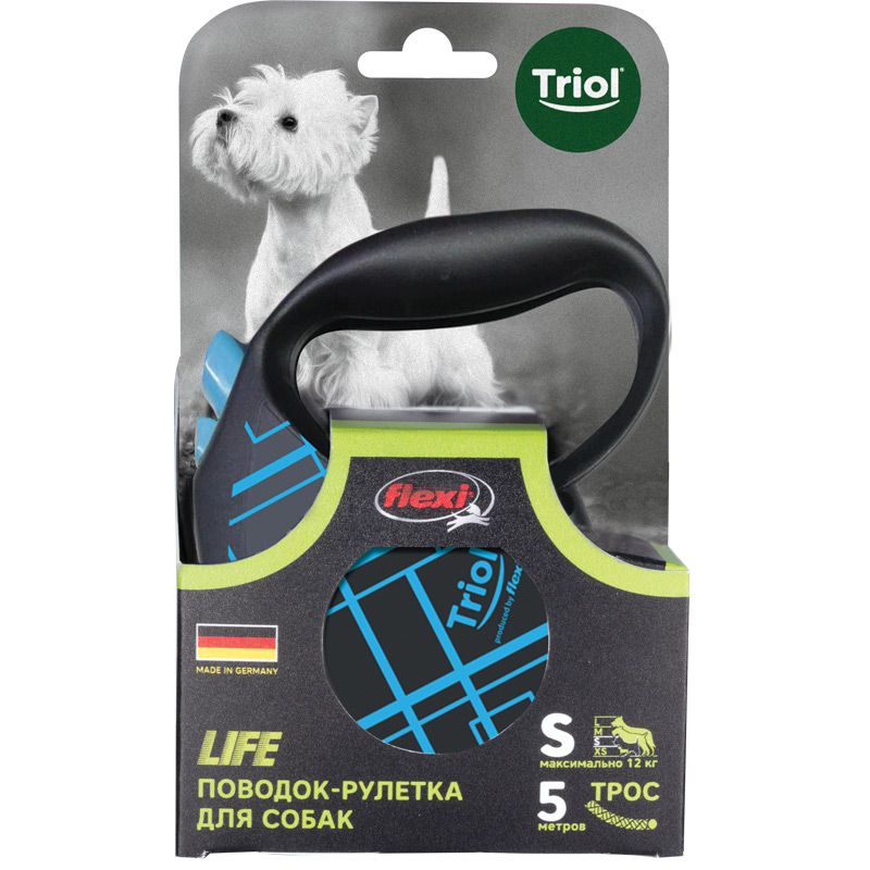 Рулетки для собак flexi – это безусловное качество, подкрепленное многолетним опытом, которое теперь доступно и поклонникам бренда TRIOL. Идеальное исполнение, прочный и, в то же время, приятный на ощупь пластик, запатентованный тормозной механизм и легендарная надежность стали более доступны благодаря сотрудничеству российской компании и немецкого производителя. Рулетки новой коллекции производятся в Германии, собираются вручную и проходят десятки проверок качества перед выпуском с завода. Гарантия производителя составляет два года и предоставляется только на функционирование механизма размотки и не распространяется на повреждения, возникшие в результате укусов собаки или прочего ненадлежащего использования рулетки. Длина троса: 5м. Максимальная нагрузка: 12кг. Цвет рулетки: черный, цвет рисунка: синий.