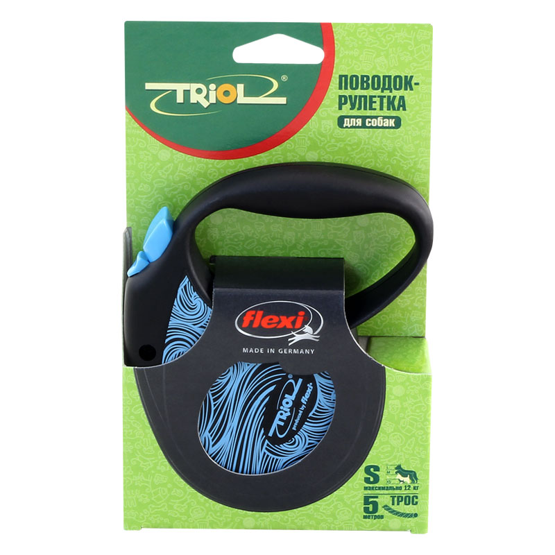 Рулетки для собак flexi – это безусловное качество, подкрепленное многолетним опытом, которое теперь доступно и поклонникам бренда TRIOL. Идеальное исполнение, прочный и, в то же время, приятный на ощупь пластик, запатентованный тормозной механизм и легендарная надежность стали более доступны благодаря сотрудничеству российской компании и немецкого производителя. Рулетки новой коллекции производятся в Германии, собираются вручную и проходят десятки проверок качества перед выпуском с завода.Гарантия производителя составляет два года и предоставляется только на функционирование механизма размотки и не распространяется на повреждения, возникшие в результате укусов собаки или прочего ненадлежащего использования рулетки. Эта оригинальная рулетка серии Colour порадует вас креативным дизайном с ярким принтом в виде абстрактных волн и дополнительными цветными элементами, выполненными в общей стилистике изделия. Длина троса: 5м. Максимальная нагрузка: 12кг. Цвет рулетки: черный, цвет рисунка: голубой.