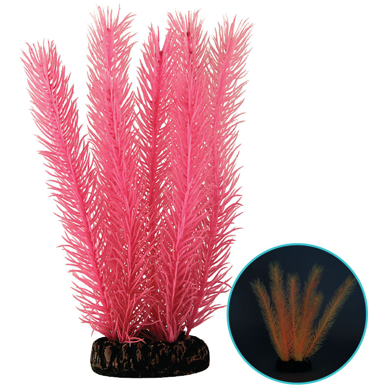 Растения - это не только завершающий штрих в оформлении, но и необходимый атрибут любого аквариума. Они придают трехмерность внутреннему пространству аквариума, а также служат дополнительным укрытием для небольших рыб, отвечая тем самым не только за эстетику, но и принося обитателям аквариума реальную пользу. Неоспоримое преимущество искусственных растений в том, что в них не заводятся паразиты и грибки, их легко мыть и дезинфицировать, и прослужат они неизмеримо дольше, чем живые растения. Изготовленное из нетоксичного пластика, светящееся растение для аквариума с тяжелой керамической подставкой "Кабомба" подойдет для оформления любых типов пресноводных аквариумов. В состав пластика входит люминофор, который в течение светового дня накапливает энергию, а в темноте начинает ее отдавать, в результате чего от растений исходит фосфоресцирующее сияние.