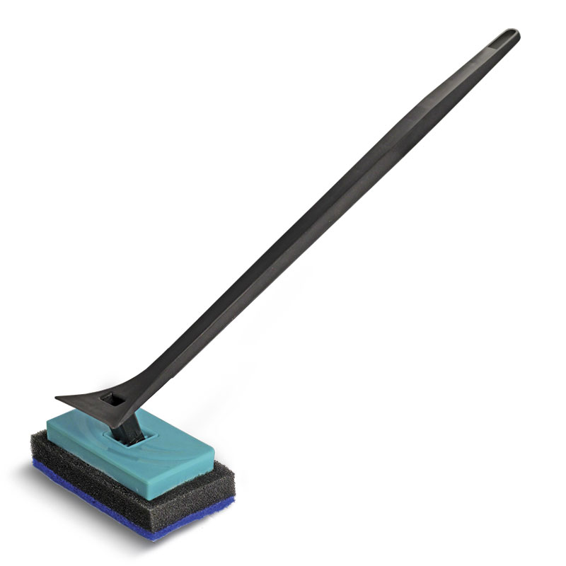 Двусторонний скребок для аквариума на длинной ручке с подвижной головкой. Очистка поверхности производится с помощью полосы жесткого нетканого материала с одной стороны и пластикового лезвия с другой.
