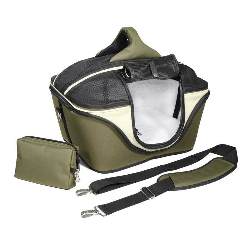 Сумка-переноска для животных L. Легко трансформируется в лежак или домик. Сумка изготовлена из плотного материала, не пропускающего солнечных лучей и защищающего питомца от дождя и ветра. Сетчатое покрытие обеспечивает отличную вентиляцию. Есть ремешок крепления для удобства и безопасности Вашего питомца. Внутри переноски лежак, который можно использовать отдельно. Все детали съемные, их можно чистить и стирать. Вход закрывается прочным сетчатым полотном при помощи надежной молнии. Удобная сумочка для хранения сопутствующих предметов. В комплекте комфортная флисовая лежанка и регулируемый наплечный ремень с металлическими элементами крепления. Сетчатое полотно можно снять и использовать переноску в качестве домика или лежанки. Цвет: хаки. Размер: 530*430*410мм. Максимальная нагрузка: 18 кг.