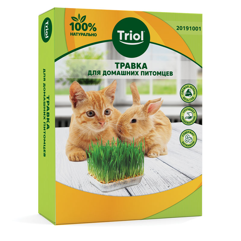 Травка Triol для животных представляет собой смесь семян высокой степени всхожести и экологически чистого минерального субстрата без каких-либо химических добавок. Нормализует пищеварительный процесс животного, является естественным источником клетчатки, углеводов, витаминов группы В, витаминов Е, Н, РР, незаменимых жирных кислот, каротина. В отличии от уличной травы не содержит химикатов, болезнетворных микроорганизмов и яйца глистов. Поедание травы является естественной потребностью животных: птицы очень любят щипать зеленую травку и купаться в ней; для кошек травка способствует очищению желудка от шерсти, а так же позволяет предотвратить поедание комнатных растений.
