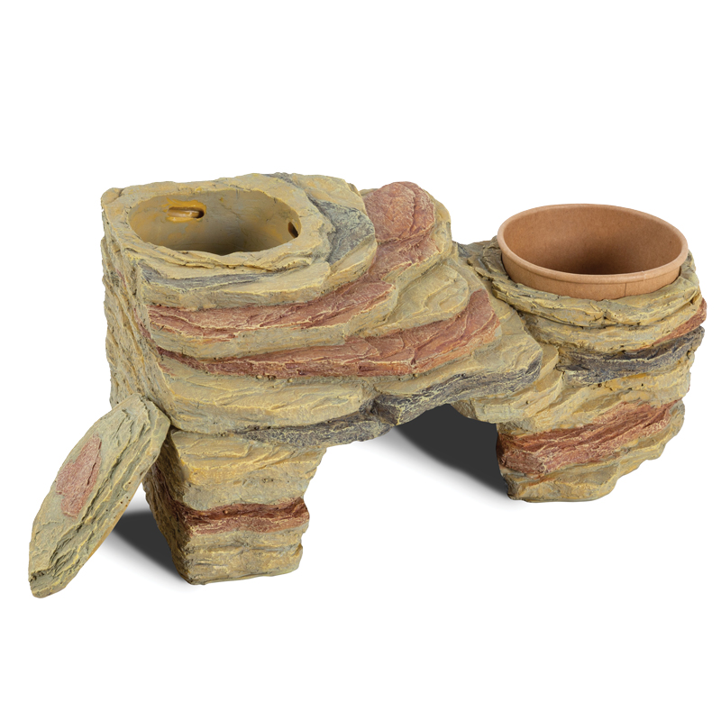 Укрытие изготовлено из нетоксичной полиэфирной смолы (прочный пластик) и является многофункциональным декором. Кроме самого укрытия, декор включает кормушку и кашпо для посадки растений.
