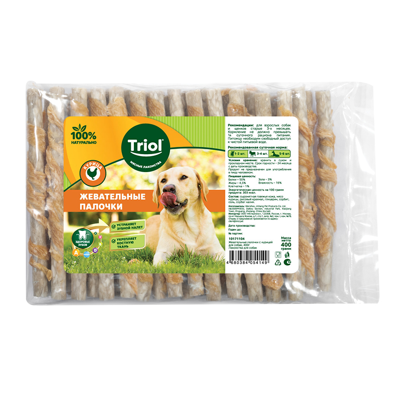 Жевательные палочки с курицей для собак - это полезное угощение для профилактики зубного камня, тренировки челюстных мышц и укрепления структуры костных тканей. Входящее в состав мясо курицы способствует повышению иммунитета и поддержаниют мышц в тонусе. Лакомство рекомендовано для взрослых собак и щенков старше трех месяцев. Масса нетто: 400г.